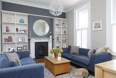 Living Room Decorating Ideas Blue Walls. A blue accent wall anchors this blue and gray living room in an authentic farmhouse remodeled by Chango and Company. It is illuminated by a chrome dome pendant that hung from the wood-paneled ceiling.